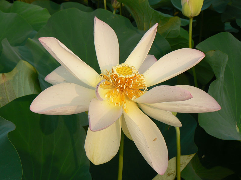 舞妃莲 舞妃莲花蕾为长桃形,粉红色,为复色花,花瓣尖部红色,中部淡绿色,基部黄色。花径24-700px,开花多,宜池塘种植,与其它水生植物配植尤佳。舞妃莲是日本引进品种,1966年日本荷花专家阪本佑二用美国黄莲花与日本“大贺莲”杂交育成。它花瓣特别长大,花姿洒脱而飘逸、宛若王妃起舞,故名“舞妃莲”。