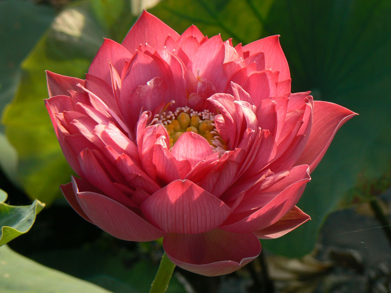 新深情 该品种母本美洲黄莲。中型,立叶高17厘米,叶径16×21厘米,花蕾红色,圆桃形。花重瓣型,瓣数112枚。花柄高29厘米,花径12厘米,花瓣长3.9-6.5厘米,宽0.7-2.7厘米。花态碗状,花色粉红色。雄蕊部分变瓣,雌蕊发育正常。着花较繁密。