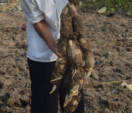 马口白莲 株高193厘米。叶径81厘米。花单瓣,白色,开花少。主藕4~6节段,长100厘米,中间节段长13厘米,横径6厘米。横断面椭圆形,通气孔道较大。藕头长筒形,梢段较长,节段不均。表皮白色,皮孔少而不明显,顶芽淡黄。子藕3~5支,单支藕重2.7千克,主藕重1.5千克。晚熟,生育期210天。耐深水、抗逆性较强。