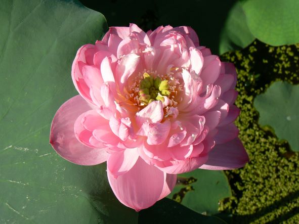 芙蓉秋色 中国荷花研究中心于1994年育成。母本为‘晓霞'。体型:中、小株型。植于2号缸中。花期:早,6月1日始花,群体花期长,为88天。着花密度:繁密。花蕾:桃形,玫瑰紫色。花型:重瓣型。花态:碗状。花色:淡堇紫色。雄蕊:多数。附属物较大,乳白色。雌蕊:部分泡状,有的能结实。株矮,叶较大,花色亮丽,花态较规整。