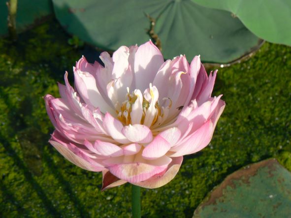 小曲 其母本为“羊城碗莲”。体型中、小株型;花蕾桃形,玫瑰红色;花型重台型;花瓣长7.6cm,宽3.2cm,瓣数63-93枚;花态碗状;花色极淡至淡堇紫色;花期较早,群体花期时间较长。其着花茂密,花色明丽淡雅,为碗莲中佳品。