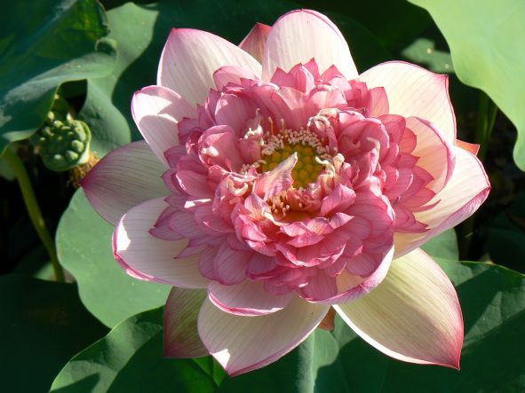 紫瑞 该品种引自南京艺莲苑,属于中小株型群重台类红莲型。该品种花蕾桃型,紫色,花色淡堇紫色,尖、脉堇紫色。花径12-20cm,着花较密,瓣数195~210枚。雄蕊少,附属物大、黄色,雌蕊瓣化,花托绿色。